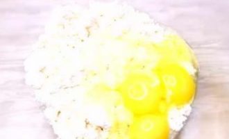 - Giet eieren met suiker bij kwark, voeg vanilline en griesmeel toe en meng alles goed.