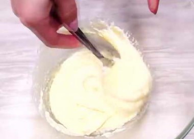 - Neem een verse, halfvette wrongel en combineer deze met zachte boter tot deze volledig homogeen is. Om dit te doen, moet je de kwark met boter goed malen met een vork of een blender gebruiken.