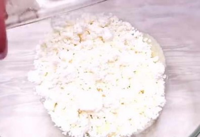 - Als het wrongelmengsel klaar is, giet je de vanilline erin en voeg je voorzichtig het zetmeel toe. Het deeg moet zorgvuldig en kwalitatief worden gemengd, zodat het zetmeel gelijkmatig wordt verdeeld.