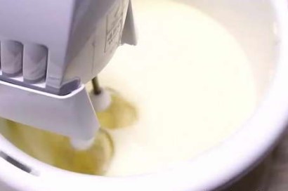 - Wanneer je de eieren grondig met suiker hebt geslagen, voeg je er kwark en zure room met melk aan toe. Klop dit alles met een blender of mixer en voeg langzaam griesmeel toe.