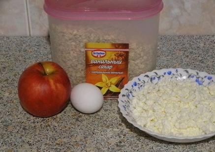 - Verwijder de schil van de appel en wrijf het fruit vervolgens op een grove rasp. We persen de resulterende puree uit het sap en combineren met kwark. Hier breken we een kippenei, voegen ook vanillesuiker toe.