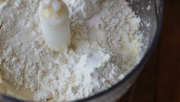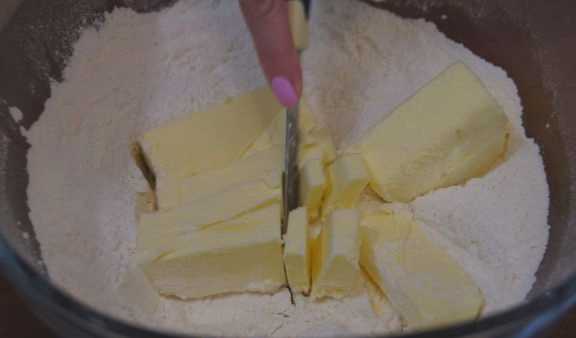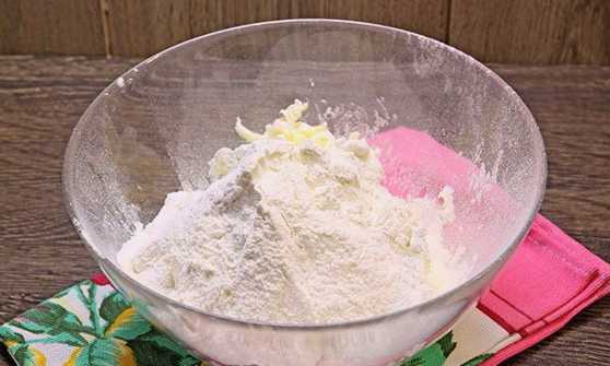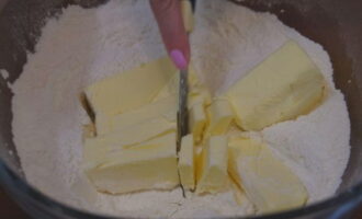 - Snijd de zacht geworden margarine in blokjes en leg ze in een diep bord. Zeef hier bloem met bakpoeder, voeg suiker toe.