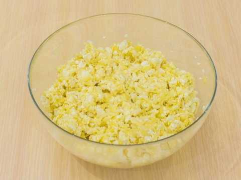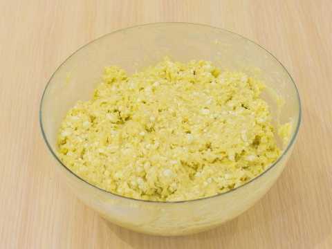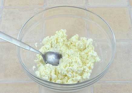 - Laten we beginnen met het bereiden van de vulling. Kneed hiervoor de kwark met suiker met een vork.