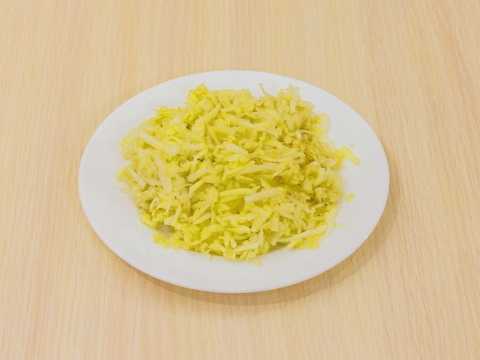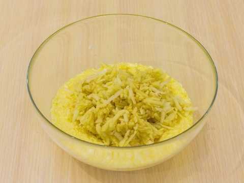 - We wrijven de boter op een grove rasp en dompelen deze onder in een diep bord, waarin het handig is om het deeg te kneden.