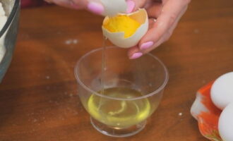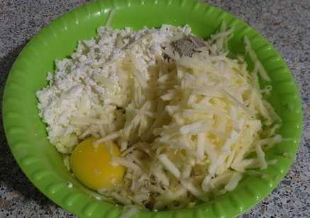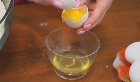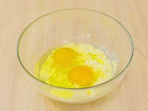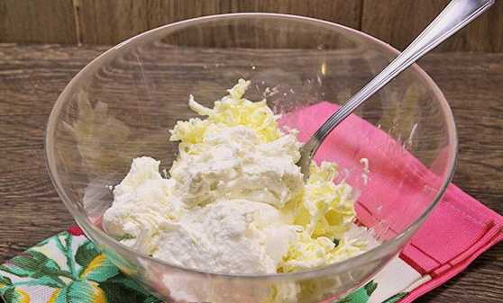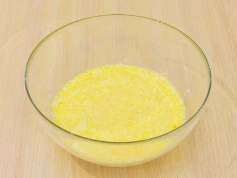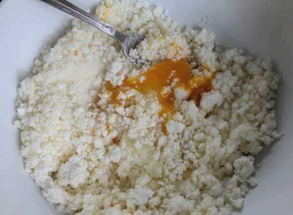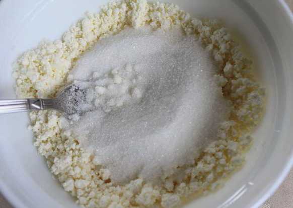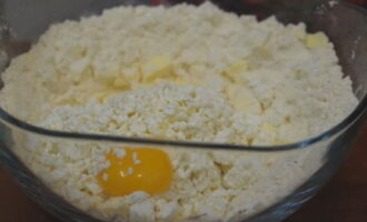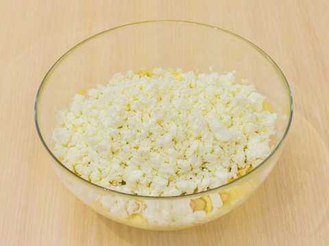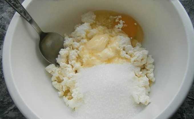 - We dompelen de kwark onder in een diepe kom. Giet er twee soorten suiker in, gesmolten boter en breek een kippenei. We malen tot een homogene massa is verkregen.