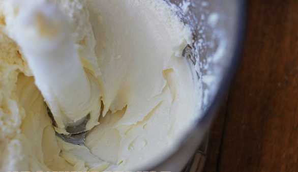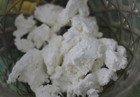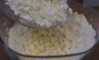 - Voeg vervolgens kwark toe aan de boter. Als het korrelig is, moet het worden voorgemalen tot een gladdere staat.
