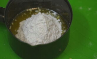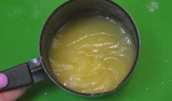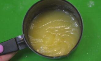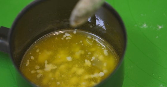 - Smelt de boter. Dit kan zowel in de magnetron als op het fornuis. Giet het hete mengsel bij de wrongel.