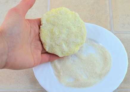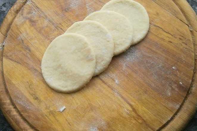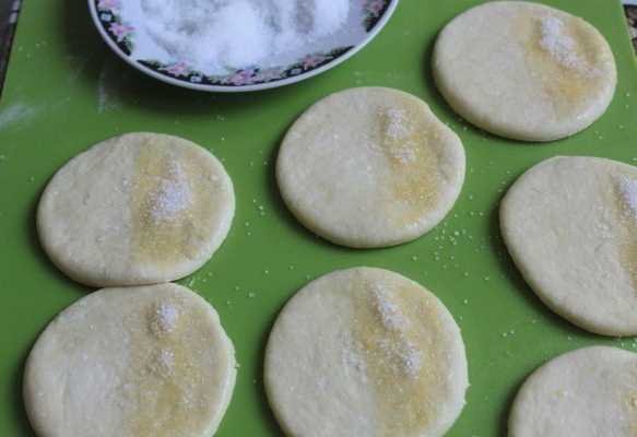 - We verdelen het deeg in 12 gelijke stukken, die elk tot een bal worden gevormd en vervolgens tot een platte cirkel worden gerold. Rol de resulterende suiker.