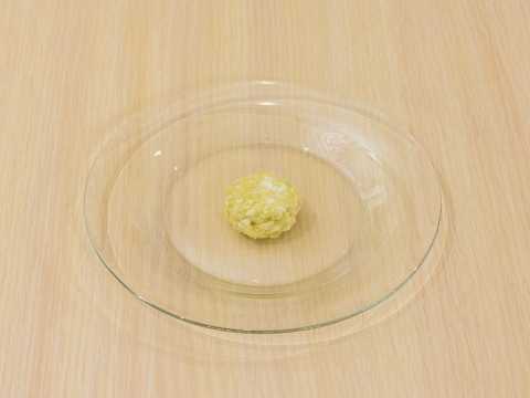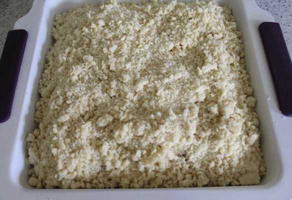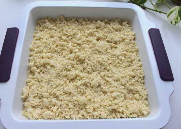 - Maal en roer de ingrediënten in een bord. Het blijkt een deeg te zijn dat op een kruimel lijkt. We zetten het product even in de koelkast.