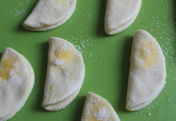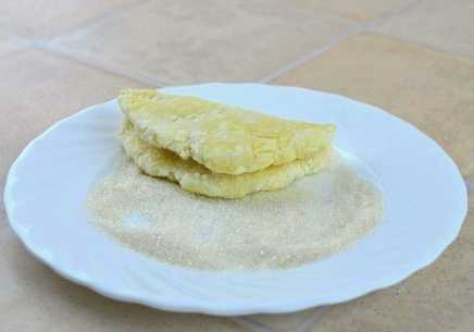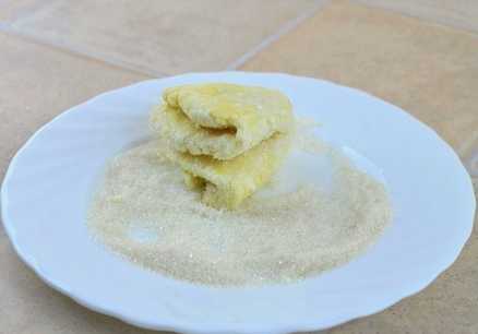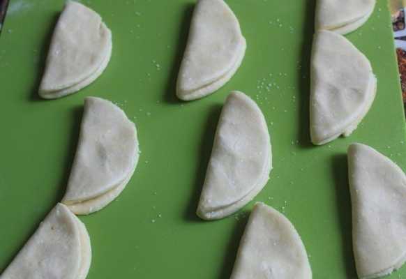 - Dan vouwen we elke cirkel twee keer dubbel en krijgen dikke driehoeken, die we meteen grondig in suiker rollen.