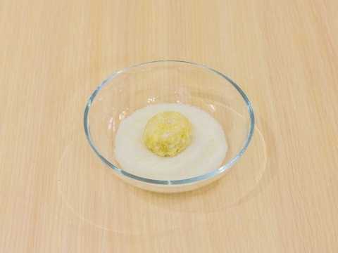 - Met onze handen vormen we kleine dichte balletjes van het appel-kwarkdeeg.
