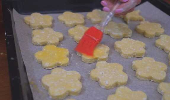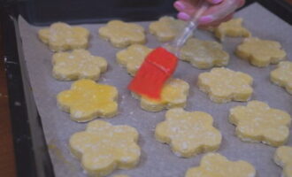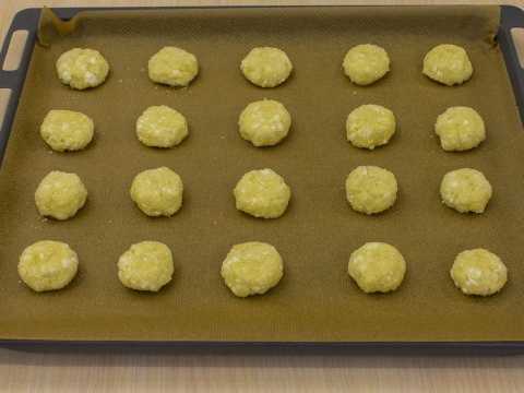 - We bedekken de bakplaat met perkament en verspreiden de koekjes erop.