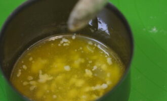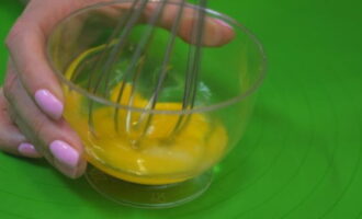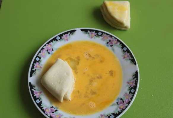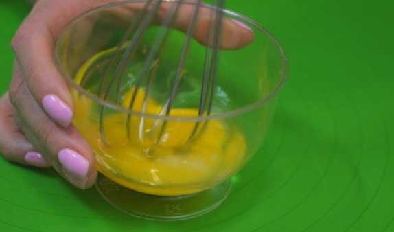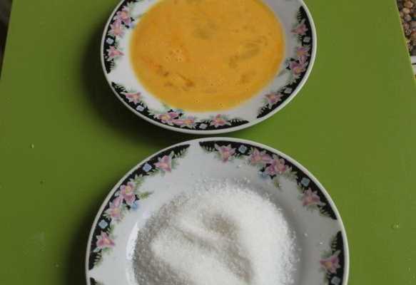 - Laten we de dressing klaarmaken. Giet suiker in een plat bord. Klop het ei goed los in een apart bord.