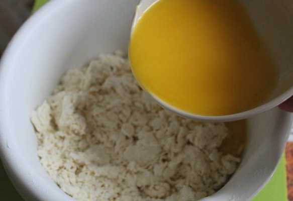 - Voeg kwark toe aan het droge mengsel. Smelt de margarine vervolgens volledig in de magnetron of op het fornuis. We gieten het hete product erin.