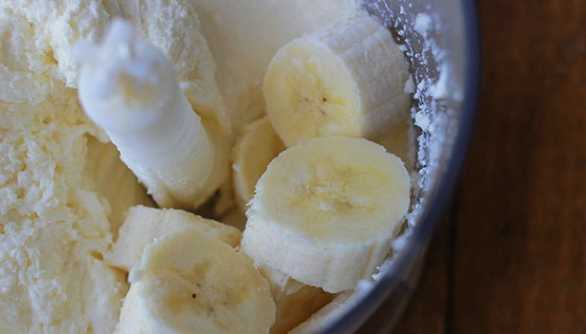 - Voeg vervolgens kwark, suiker en in kleine stukjes gesneden banaan toe aan de boter. We blijven kloppen tot het glad en homogeen is.