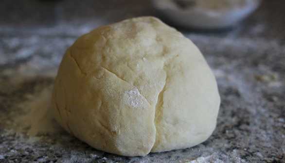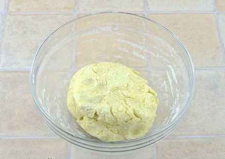 - Zeef de bloem, voeg bakpoeder toe en kneed het deeg grondig tot je een dichte, homogene klont krijgt.