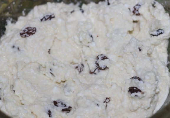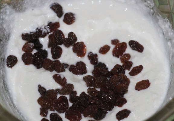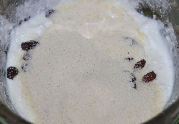 - Doe vanilline, honing in de massa en meng de inhoud grondig tot een gladde massa. Giet er twee eetlepels rozijnen in.