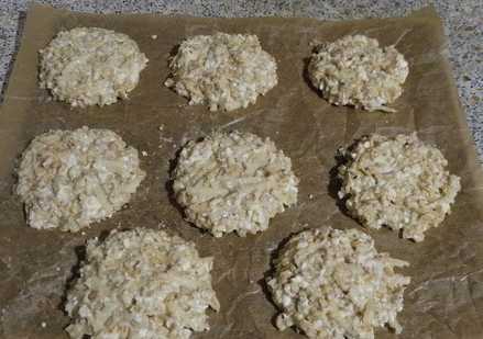 - Verspreid met een lepel de massa in de vorm van een rond koekje op een bakplaat met perkamentpapier. We sturen het 15 minuten naar een voorverwarmde oven op 180 graden.