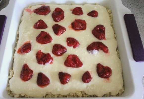 - Nu leggen we een laag wrongelvulling. We strooien de bessen.