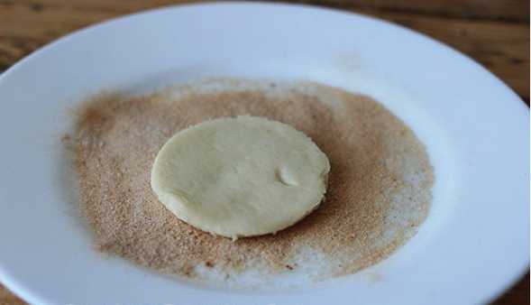 - Combineer poeder en kaneel in een plat bord. Rol elke cirkel in het mengsel.