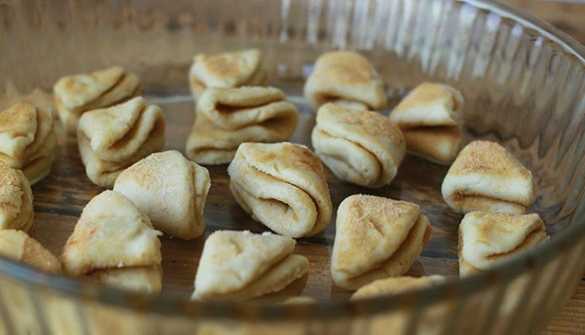 - Vouw daarna de cirkels twee keer dubbel. We krijgen koekjes met een ongewone weelderige vorm. Rol het product opnieuw in een mengsel van kaneel en poeder.