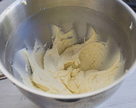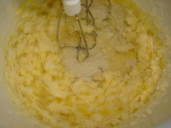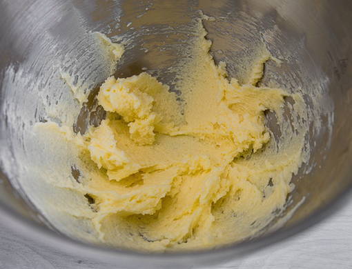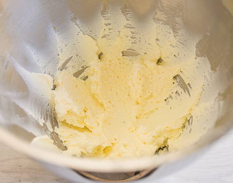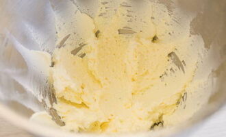 - Klop in een aparte kom de boter op kamertemperatuur met suiker met een mixer gedurende enkele minuten tot een luchtige room is verkregen.