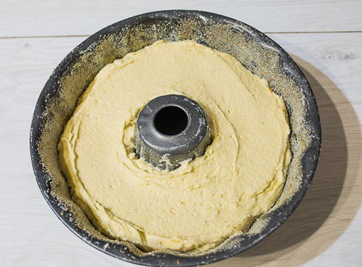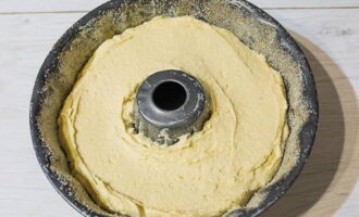 Vet een vorm met een diameter van 26 cm in met boter en bestrooi met paneermeel. Giet het deeg in de vorm en plaats in de voorverwarmde oven op 180°C. We bakken de cake 40-45 minuten. We controleren de gereedheid met een match.