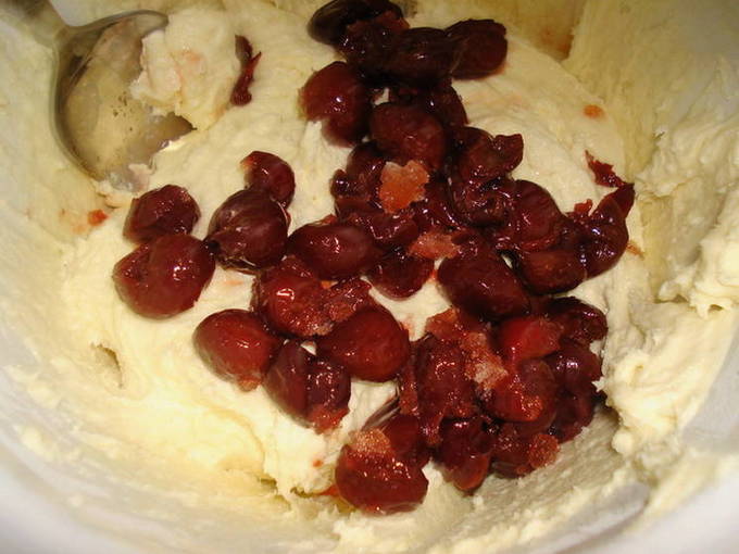 - Voeg nu de kersen toe en roer voorzichtig met een lepel zodat ze door het deeg worden verdeeld.