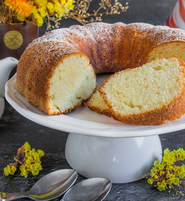 De schil geeft deze cake een aangename citroensmaak en een licht zure smaak, en het citroenglazuur decoreert alleen en geeft een aangename zuurheid.
