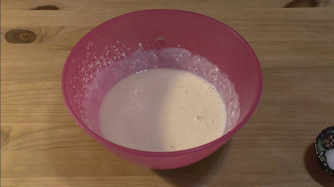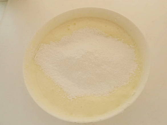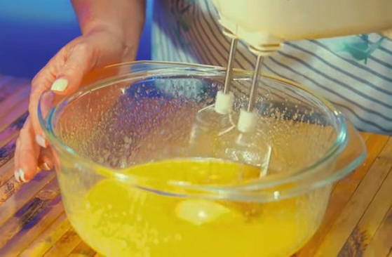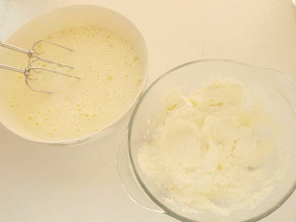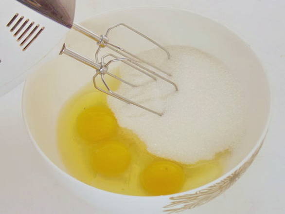 - Klop met een mixer eieren met suiker tot luchtig schuim.