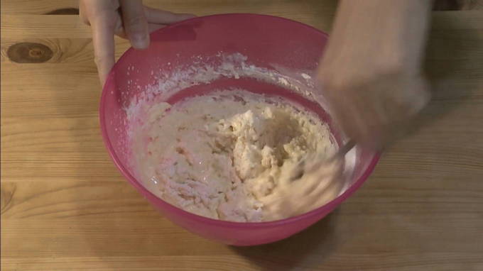 - Maal in een diepe kom met een vork voorzichtig de kwark samen met de suiker. Je kunt een blender gebruiken om de cake malser te maken.