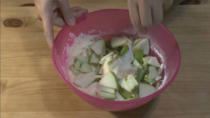- Was de appels, snij in kleine stukjes en voeg toe aan het deeg. Roer tot ze gelijkmatig over de massa zijn verdeeld.