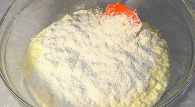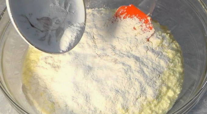 - Zeef bloem met bakpoeder en soda door een zeef. Roer met een siliconen spatel tot een gladde massa.