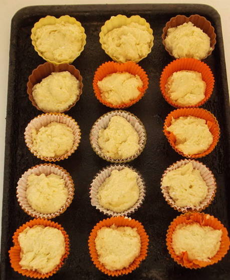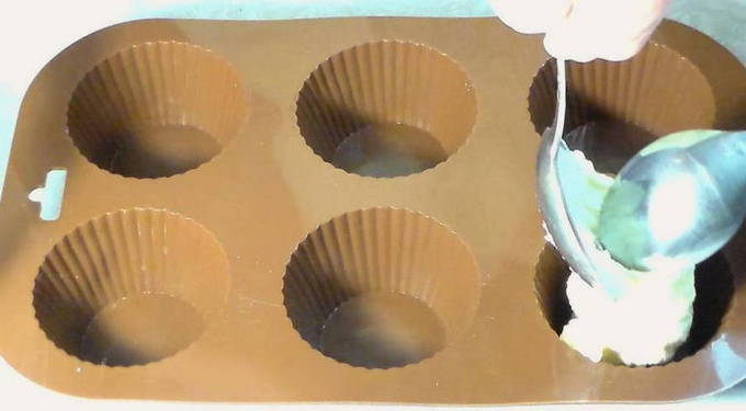 - Siliconen mallen hoeven niet gesmeerd te worden. We verspreiden het deeg in porties zodat elke vorm ongeveer dezelfde hoeveelheid heeft.