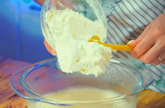 - Voeg kwark en zure room toe aan de losgeklopte eieren. Meng alles goed.