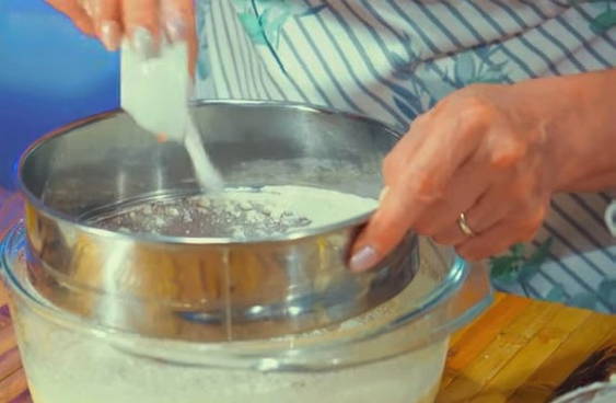 - Zeef 140 gram bloem, soda en bakpoeder tot de resulterende massa door een zeef. Mix alles goed door elkaar met een mixer.