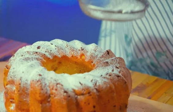 - Laat de afgewerkte cake iets afkoelen en bestrooi met poedersuiker. Eet smakelijk!