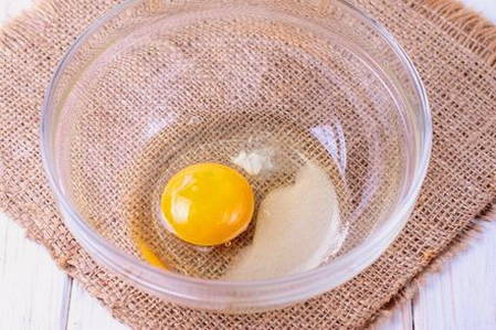 - Breek het ei in een kom en voeg daar de suiker toe. Klop met een mixer tot luchtig schuim is verkregen. Suiker is optioneel, of in plaats daarvan kan zoetstof worden toegevoegd.