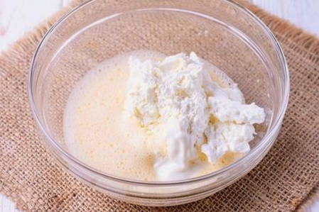 - Smelt de boter in een magnetron of in een waterbad en laat volledig afkoelen. Klop de eieren, suiker en kwark in een aparte kom met een mixer tot een gladde massa.