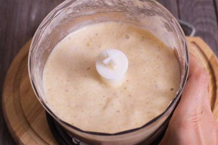 - Schil de banaan en snij in kleine stukjes. Maal met een blender tot puree. Je kunt de banaan ook fijnprakken met een vork als je wilt dat de muffin dik is.