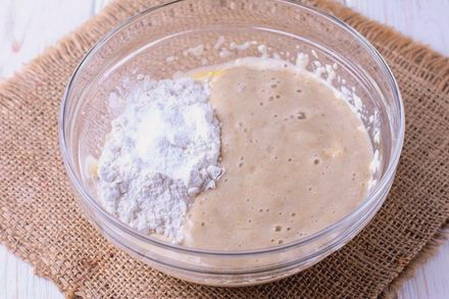 - Voeg door een zeef gezeefde bloem, bakpoeder, bakpoeder en zout toe aan het mengsel. Meng alles goed met een siliconen spatel tot een homogene massa is verkregen. Het deeg moet behoorlijk dik zijn.