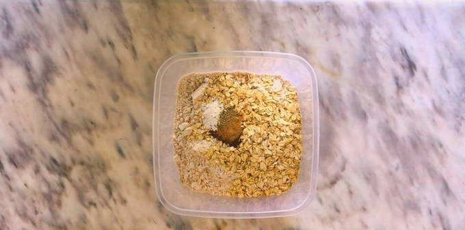 - Meng eerst alle droge ingrediënten. In een bak doen we speltmeel, havermout, bakpoeder, zout, kaneel, kruidnagel en kardemom. We mengen alles met een siliconen spatel.