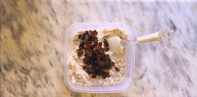 - Spoel de rozijnen grondig af en leg ze op keukenpapier om volledig te drogen. Voeg het toe aan droge ingrediënten.
