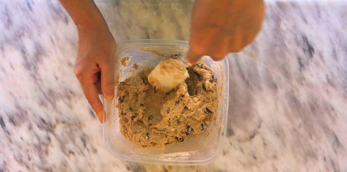 - Spoel de rozijnen af met water en laat ze drogen op keukenpapier. Voeg de rozijnen toe aan het deeg en meng zodat het gelijkmatig door de massa wordt verdeeld.