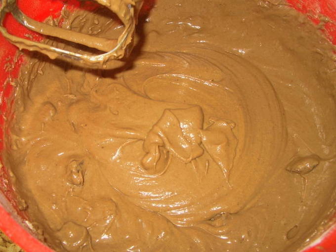 - Mix alles goed door elkaar met een mixer. Het deeg moet luchtig zijn en qua consistentie lijken op gesmolten chocoladepasta.