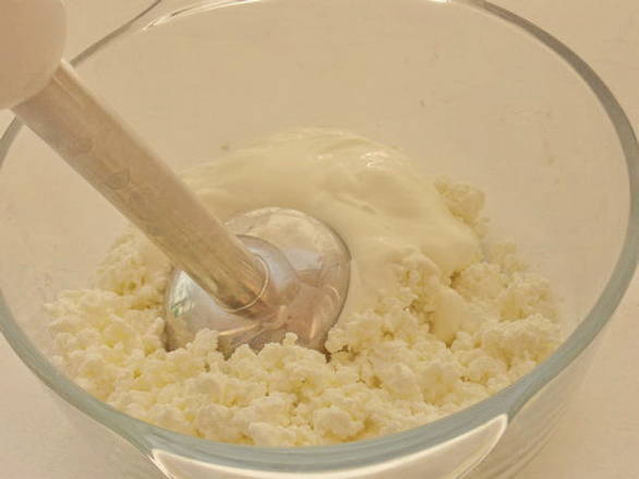 - Klop in een aparte container de kwark met zure room met een blender tot een homogene massa is verkregen.