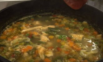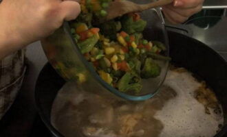 Voeg groenten toe aan de kokende bouillon, roer en kook op laag vuur gedurende ongeveer 15 minuten.