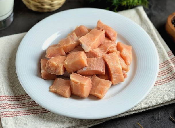 - Scheid het forelvlees van het vel en de botten. Snijd in middelgrote blokjes en dek af met huishoudfolie.