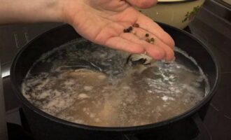We wassen de set onder stromend water en zetten hem in een pan met koud water. Zet de vis op het vuur en voeg een paar zwarte peperkorrels toe.