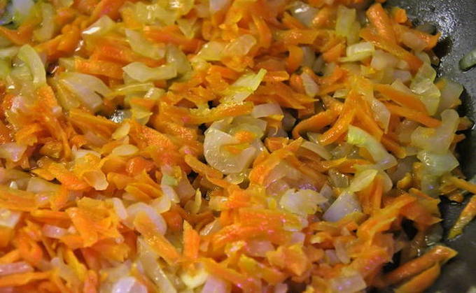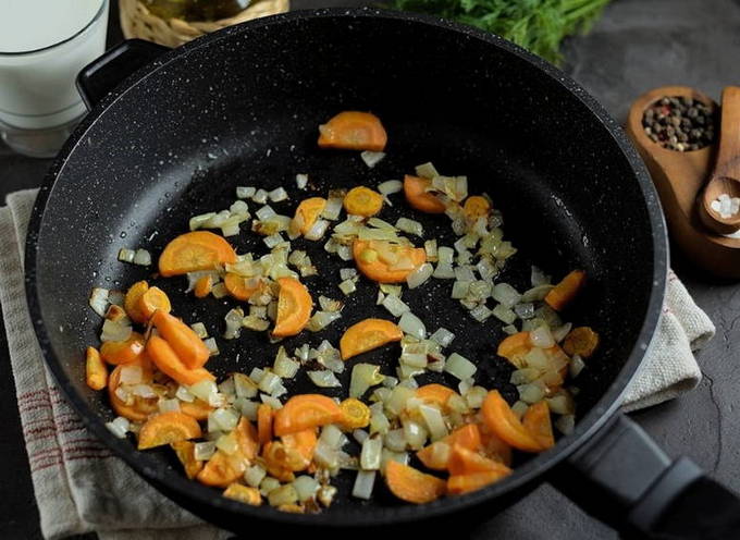 - Bak uien met wortelen in een pan tot de uien transparant zijn.